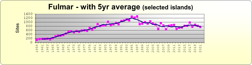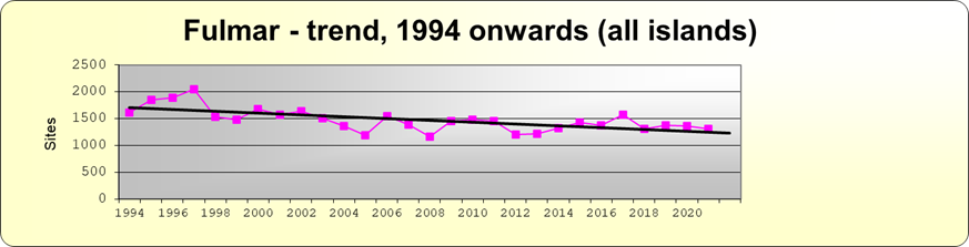 Fulmar do not have a nest as such, they just lay their egg in a shallow scrape. Therefore it is the number of apparently occupied sites that is counted. A site is counted as occupied only when a bird appears to be sitting tightly on a reasonably horizontal area judged large enough to hold an egg.