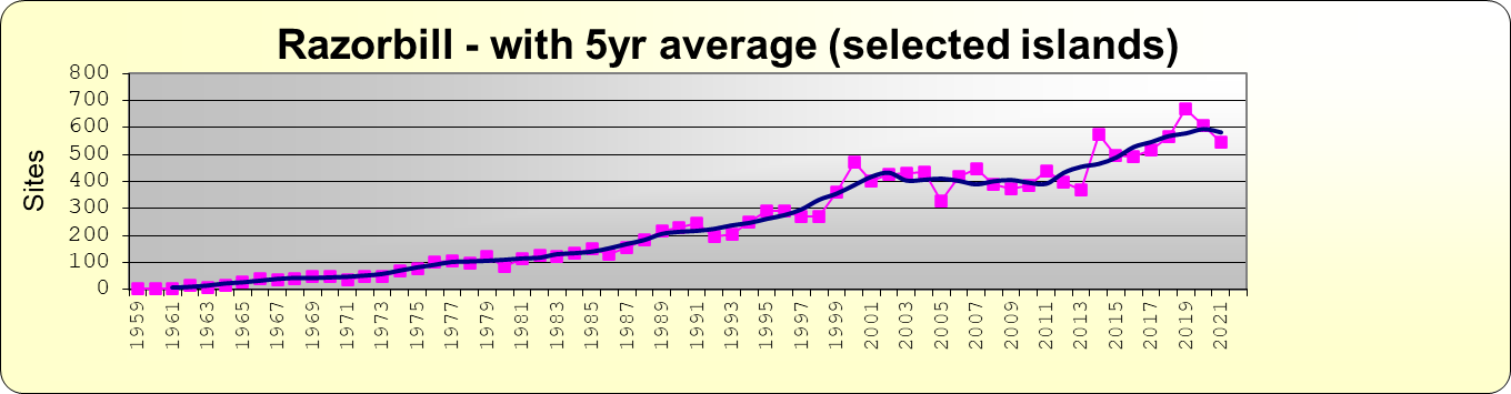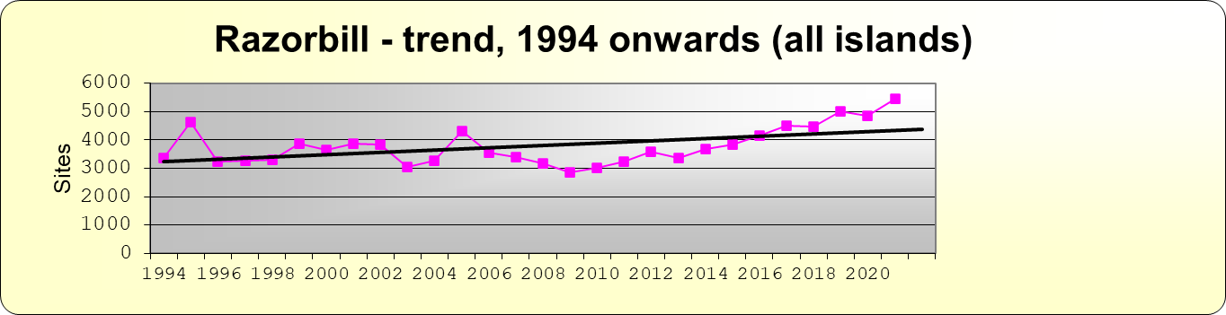 When counting Razorbill, we count the number of apparently occupied sites. A site is counted as occupied when a bird appears to be sitting tightly on a reasonably horizontal area judged large enough to hold an egg.